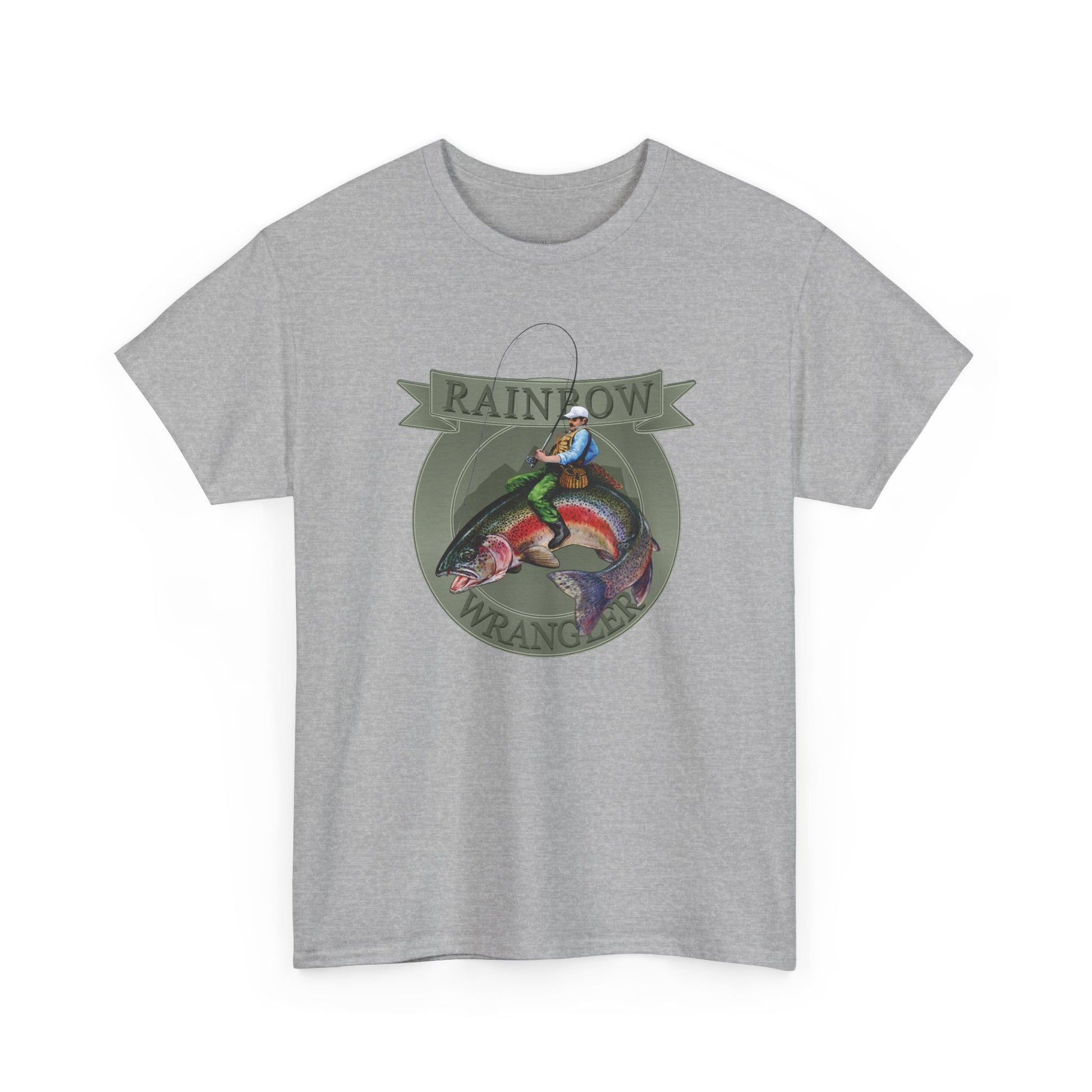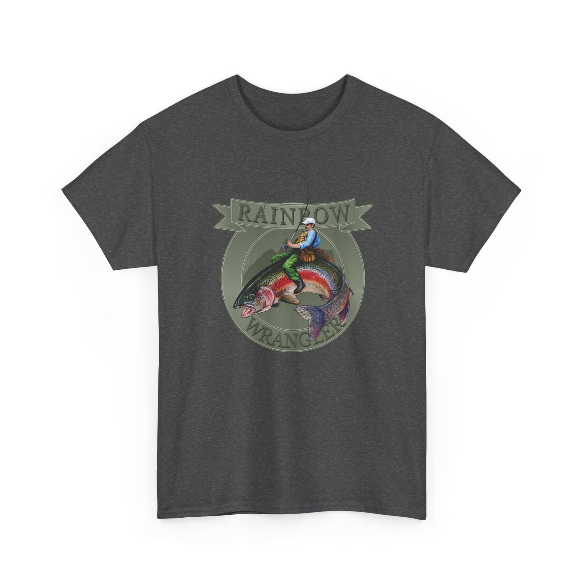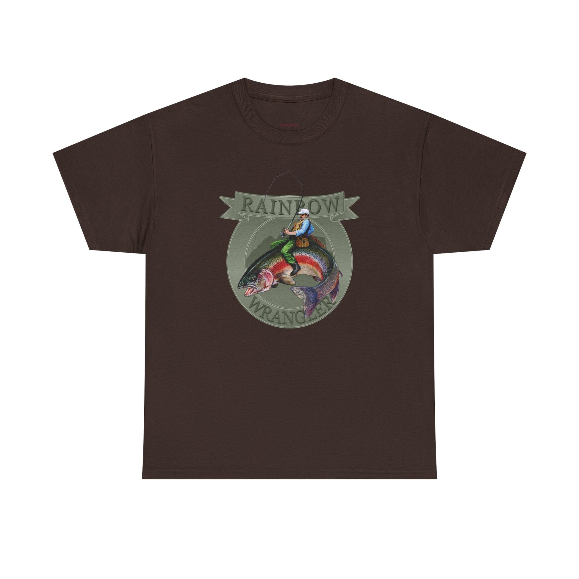 A rugged tee that tells a story of riverbanks at dawn. The painted Rainbow Wrangler motif — a man reeling and wrangling a rainbow trout — feels hand-brushed, alive with motion and summer light. Wear it to the marina, on a porch after a long day of casting, or while swapping fishing tall tales around a camp stove. The mid-weight cotton gives it a lived-in comfort that pairs with worn jeans and a weathered cap. Give voice to that outdoorsy pride on birthdays or Father’s Day; it starts conversations about the one that got away and the ones you actually landed.