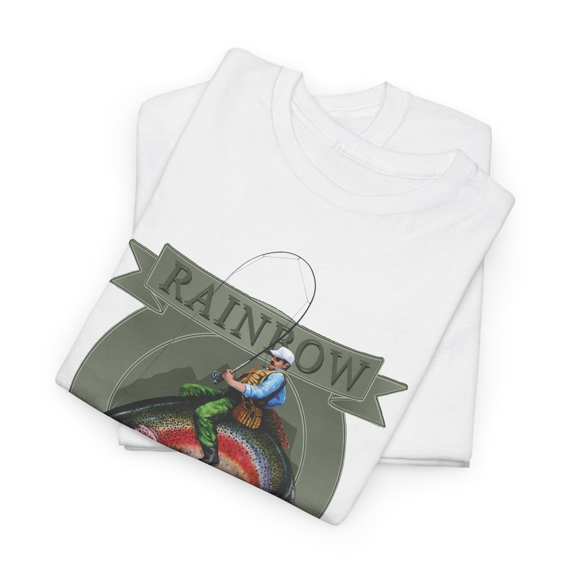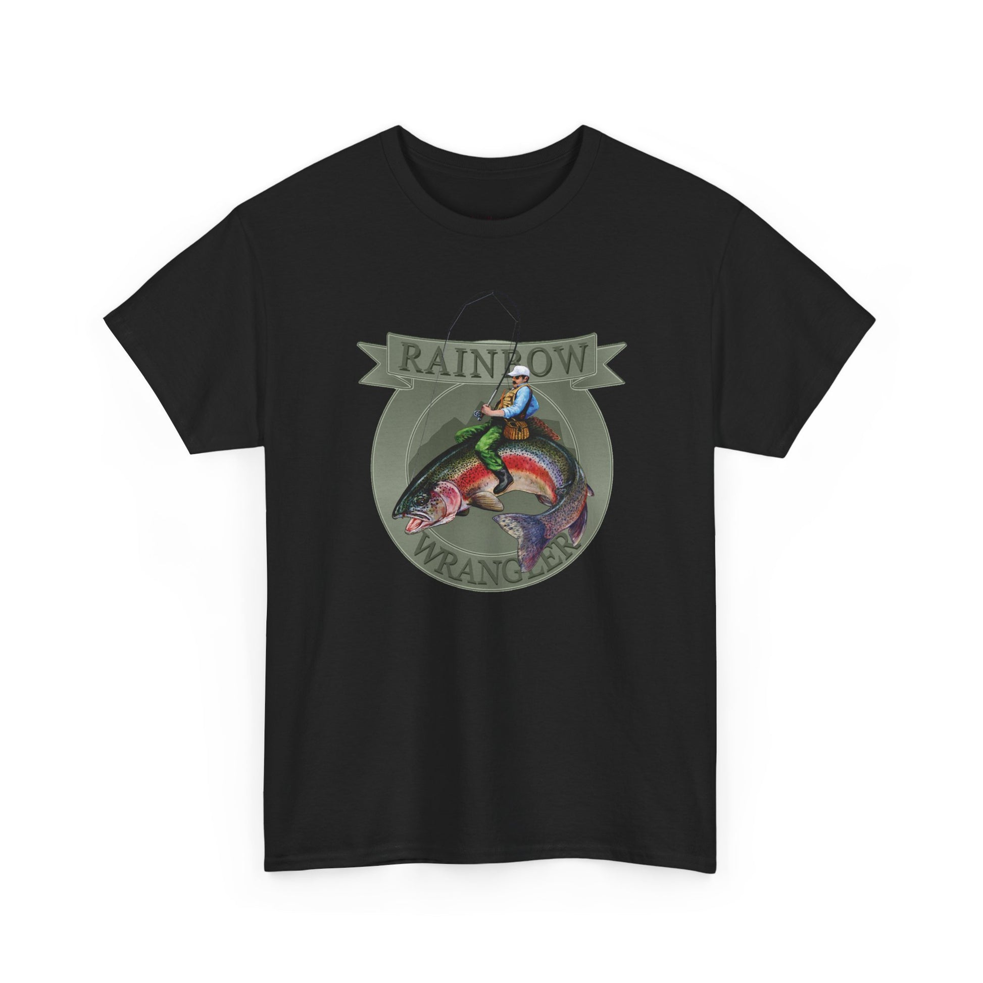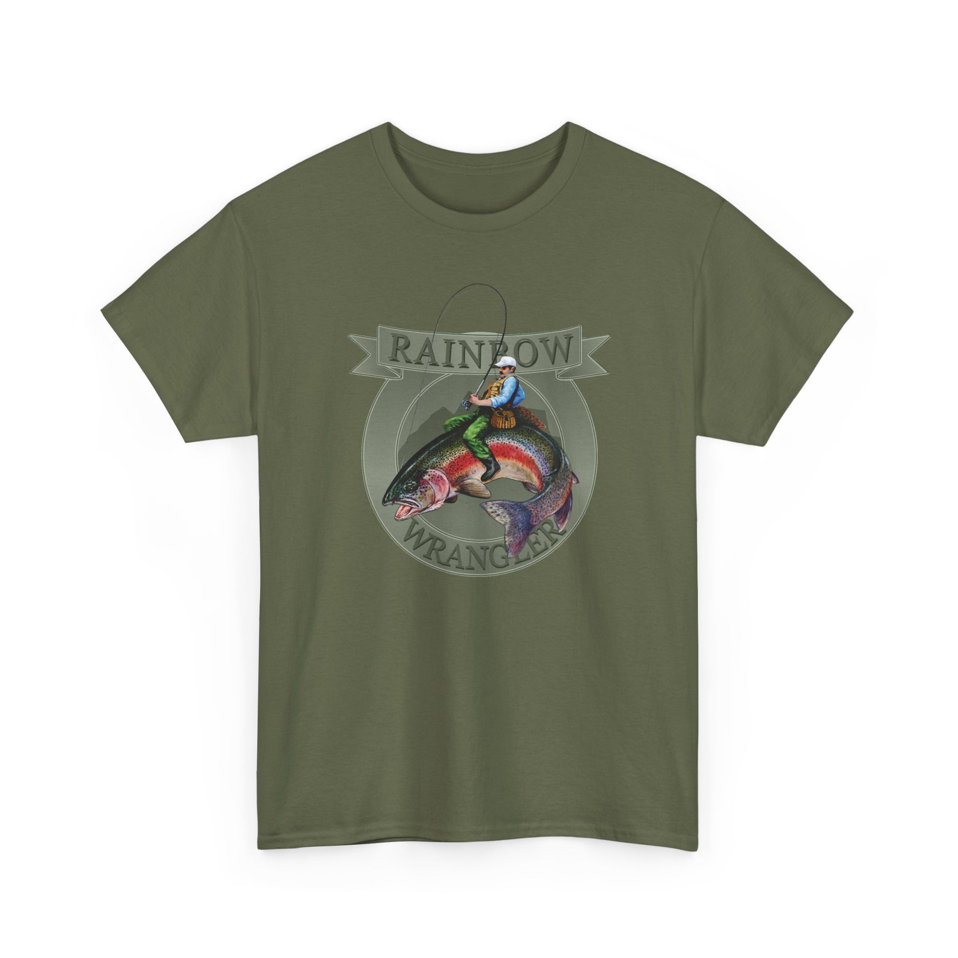 A rugged tee that tells a story of riverbanks at dawn. The painted Rainbow Wrangler motif — a man reeling and wrangling a rainbow trout — feels hand-brushed, alive with motion and summer light. Wear it to the marina, on a porch after a long day of casting, or while swapping fishing tall tales around a camp stove. The mid-weight cotton gives it a lived-in comfort that pairs with worn jeans and a weathered cap. Give voice to that outdoorsy pride on birthdays or Father’s Day; it starts conversations about the one that got away and the ones you actually landed.